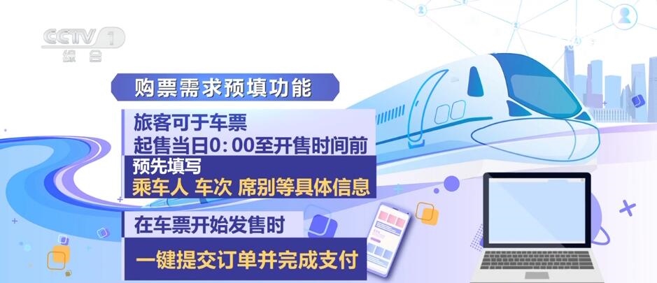 鐵路部門今年還增加了購票需求預填功能,旅客可于車票起售當日0:00至開售時間前,預先填寫乘車人、車次、席別等具體信息,在車票開始發(fā)售時一鍵提交訂單并完成支付。