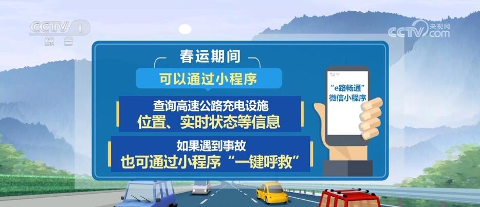 為提升今年春運服務,交通運輸部還上線“e路暢通”微信小程序,春運期間,大家可以通過小程序,查詢高速公路充電設施位置、實時狀態(tài)等信息,如果遇到事故,也可通過小程序“一鍵呼救”。