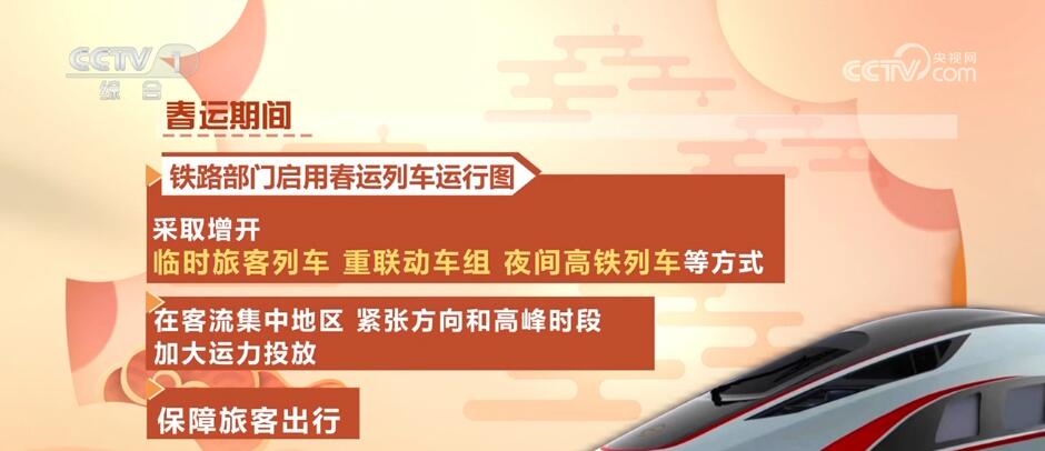 春運期間,鐵路部門啟用春運列車運行圖,采取增開臨時旅客列車、重聯動車組、夜間高鐵列車等方式,在客流集中地區(qū)、緊張方向和高峰時段加大運力投放,保障旅客出行。國鐵濟南局春運期間安排臨客超90對,其中開行去往北京、上海、石家莊、哈爾濱、福州等方向跨省臨客47對。國鐵武漢局春運首日加開臨客49對,哈爾濱鐵路部門安排開行臨客列車74對,太原鐵路部門安排開行臨客列車64對。