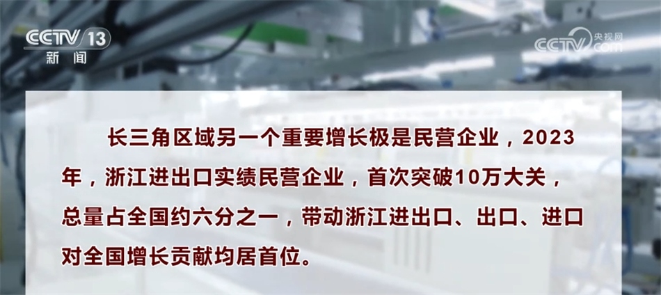 長(zhǎng)三角區(qū)域另一個(gè)重要增長(zhǎng)極是民營(yíng)企業(yè),2023年,浙江進(jìn)出口實(shí)績(jī)民營(yíng)企業(yè)首次突破10萬(wàn)大關(guān),總量占全國(guó)約六分之一,帶動(dòng)浙江進(jìn)出口、出口、進(jìn)口對(duì)全國(guó)增長(zhǎng)貢獻(xiàn)均居首位。