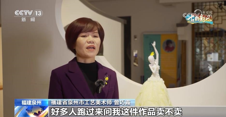 福建省泉州市工藝美術(shù)師 曾巧霞:這件作品是以芭蕾舞的形式去表現(xiàn)的,然后結(jié)合我們德化這種薄胎和手捏花的工藝來(lái)表現(xiàn)整件作品。我把這件作品帶到國(guó)博去展出,好多人跑過(guò)來(lái)問(wèn)我賣不賣,現(xiàn)在不是沒(méi)人要,是訂單多到已經(jīng)做不出來(lái)的問(wèn)題了。