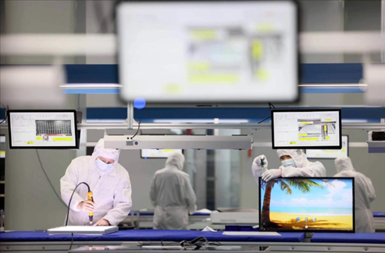 在合肥市瑤海區(qū)的中國(guó)網(wǎng)谷,一家電子科技公司的員工在智慧顯示屏生產(chǎn)線上作業(yè)。新華社發(fā)(解琛攝)