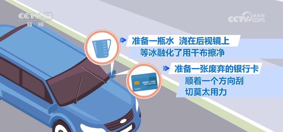 萬一后視鏡被凍住怎么辦呢?如果您的車輛后視鏡具備加熱功能,那這個問題就很容易解決了。但是如果不具備這樣的功能,有兩樣隨手可得的小物件可以幫您輕易解決。一是準備一瓶水澆在后視鏡上,等冰融化了用干布擦凈;另外可以準備一張廢棄的銀行卡,順著一個方向把后視鏡上的冰刮下來。