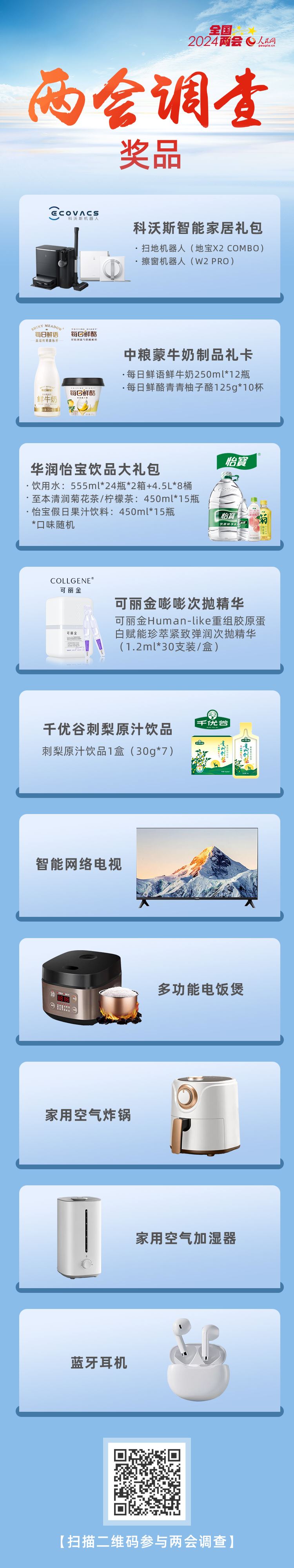 為感謝網(wǎng)友對全國兩會調(diào)查的支持,參與人民網(wǎng)2024年全國兩會調(diào)查還有機(jī)會抽取精美獎(jiǎng)品。