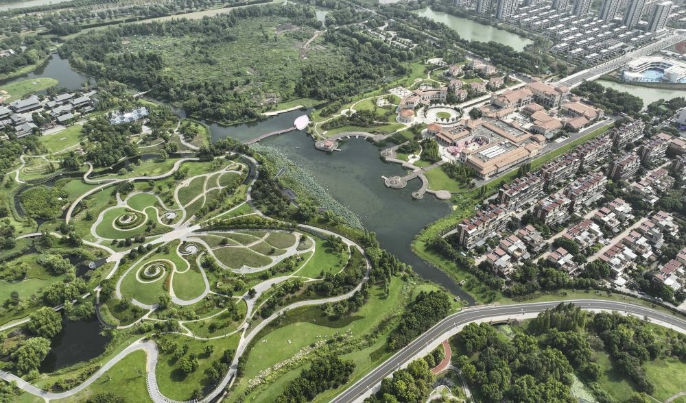 位于浙江省湖州市八里店鎮(zhèn)的西山漾國(guó)家城市濕地公園和周邊的居民區(qū)相互融合(無人機(jī)照片,2023年8月23日攝)。新華社記者 翁忻旸 攝