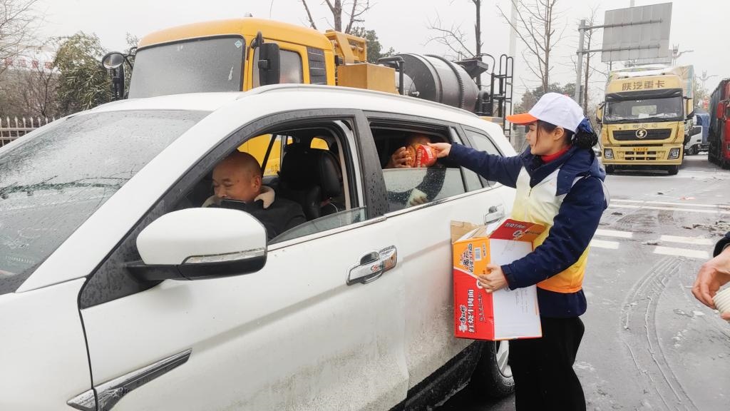 為讓滯留人員能吃上暖心飯,當(dāng)?shù)攸h委政府組織志愿者送來免費的方便面、八寶粥、熱水等。