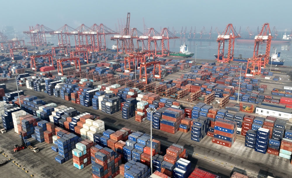 在浙江寧波舟山港梅山港區(qū)碼頭,大型設(shè)備在吊運集裝箱(2024年1月24日攝,無人機照片)。新華社記者 黃宗治 攝