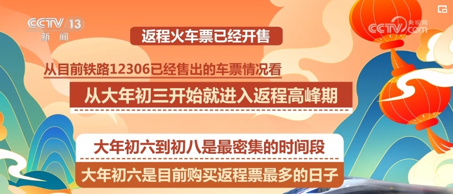 春節(jié)的返程火車(chē)票已經(jīng)開(kāi)售,從目前鐵路12306已經(jīng)售出的車(chē)票情況看,從大年初三開(kāi)始就進(jìn)入大家返程的高峰期,大年初六到初八是最密集的時(shí)間段,其中,大年初六是目前購(gòu)買(mǎi)返程票最多的日子。