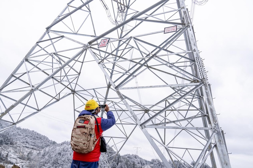 2月9日,在彭水縣中嶺山,國網(wǎng)重慶電力員工對電力線路開展冰雪特巡。牟偉攝