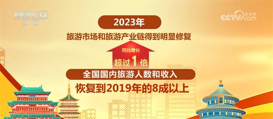 2023年,旅游市場和旅游產(chǎn)業(yè)鏈得到明顯修復,全國國內(nèi)旅游人數(shù)和收入同比增長超過1倍,恢復到2019年的8成以上;入出境旅游人數(shù)超過1.9億人次,較上一年增長2.8倍以上。