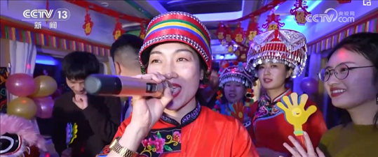 就在記者采訪時,列車員邀請大家去一號車廂參加一個聯(lián)歡會。春節(jié)爆滿的車廂,讓他們也感受到了濃濃的年味兒。