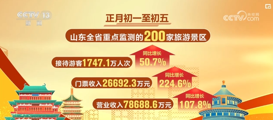 正月初一至初五,山東全省重點(diǎn)監(jiān)測的200家旅游景區(qū),累計(jì)接待游客超過1747萬人次,門票收入超2.6億元,營業(yè)收入超7.8億元,與上年同期相比,分別增長50.7%、224.6%、107.8%。