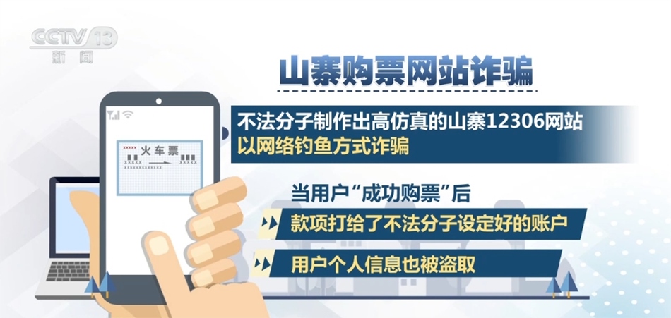 山寨購票網(wǎng)站詐騙:不法分子制作出高仿真的山寨12306網(wǎng)站,以網(wǎng)絡(luò)釣魚方式詐騙,這些網(wǎng)站在頁面布局、域名上與12306網(wǎng)站非常相似。當(dāng)用戶“成功購票”后,款項打給了不法分子設(shè)定好的賬戶,用戶個人信息也被盜取。