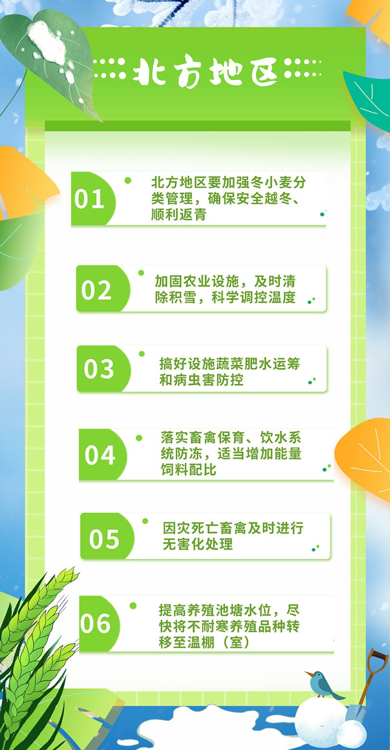 北方地區(qū)要加強(qiáng)冬小麥分類管理,確保安全越冬、順利返青;加固農(nóng)業(yè)設(shè)施,及時清除積雪,科學(xué)調(diào)控溫度;搞好設(shè)施蔬菜肥水運(yùn)籌和病蟲害防控;落實畜禽保育、飲水系統(tǒng)防凍,適當(dāng)增加能量飼料配比;因災(zāi)死亡畜禽及時進(jìn)行無害化處理;提高養(yǎng)殖池塘水位,盡快將不耐寒養(yǎng)殖品種轉(zhuǎn)移至溫棚(室)。