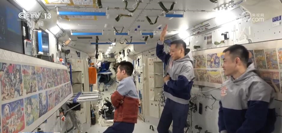 神舟十七號航天員乘組在鏡頭面前介紹“天宮畫展”時說:“全國各地的青少年朋友們,大家新年好!我們是神舟十七號航天員乘組,這里是咱們中國人自己的太空家園——中國空間站。分享一個好消息,大家期盼已久的天宮畫展又‘上新’了!”