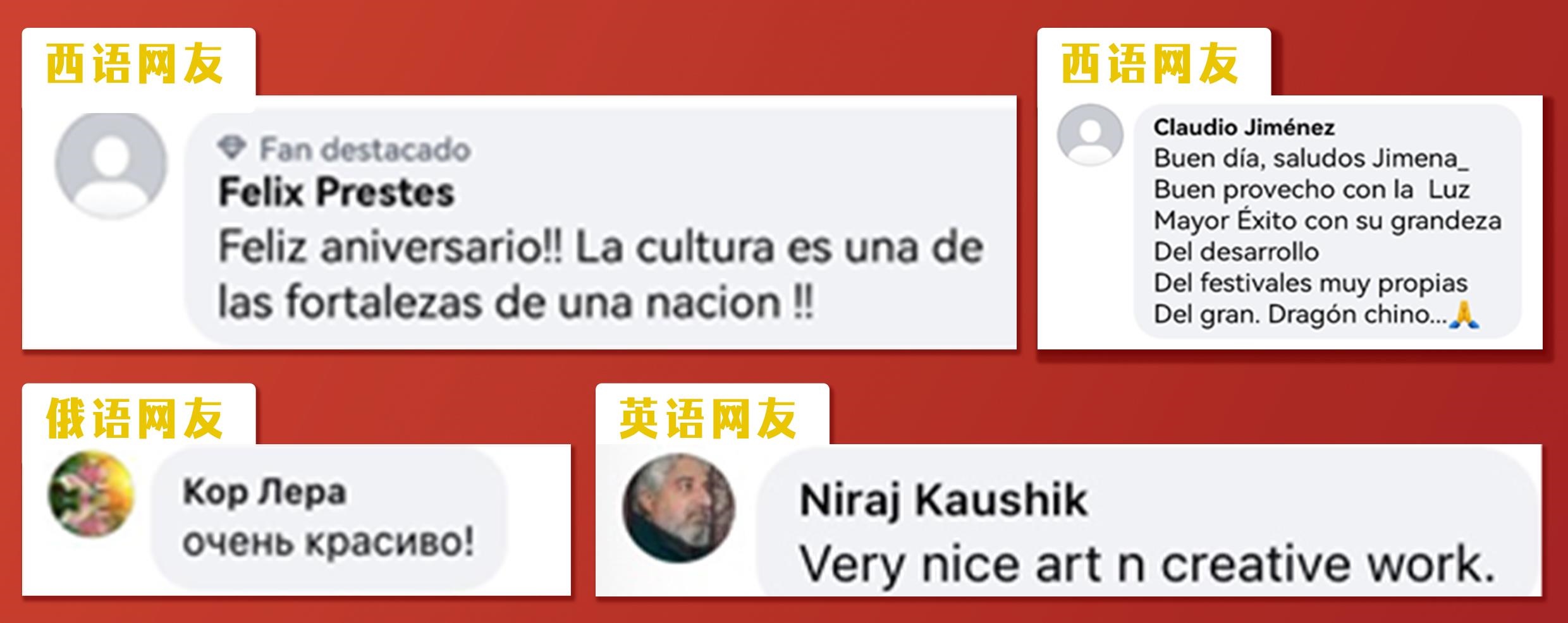 文明魅力無國界,中國文化受海外網(wǎng)友追捧。《彩云追月》《小雅·鹿鳴》《蒲公英的天空》等節(jié)目讓海外受眾領(lǐng)略了元宵晚會蘊含的文化底蘊。眾多海外網(wǎng)友紛紛留言表達(dá)了對中華文化和中國節(jié)日的喜愛。西語網(wǎng)友Claudio Jiménez留言:“中國擁有這么多自己的節(jié)日,好棒”。西語網(wǎng)友Felix Prestes說:“文化是一個國家的基石,祝你們節(jié)日快樂!”英語網(wǎng)友Niraj Kaushik和Cham Gurung評論說:“很美且很有創(chuàng)意的作品”“節(jié)目令人印象深刻,我很喜歡”。