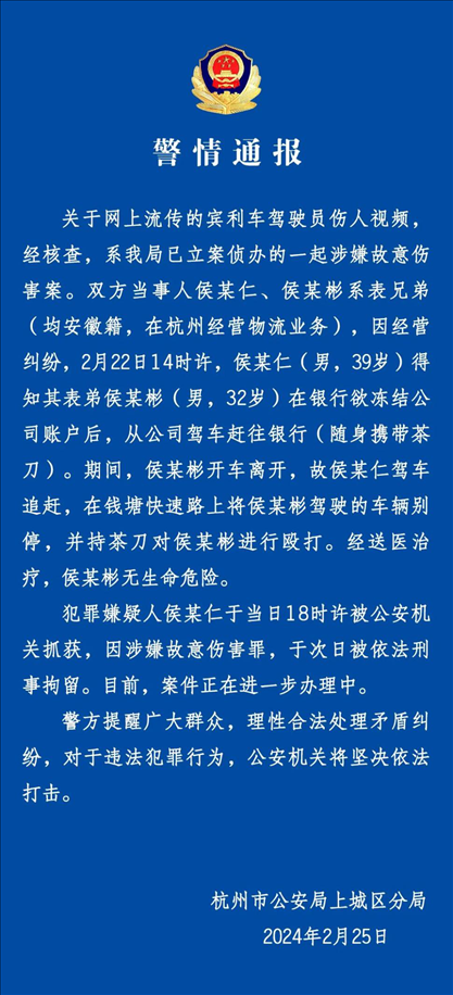 ·杭州警方通報(bào)“賓利司機(jī)傷人”案件,當(dāng)事雙方系表兄弟,因經(jīng)營糾紛而出現(xiàn)別車、毆打的情況,犯罪嫌疑人被刑拘。