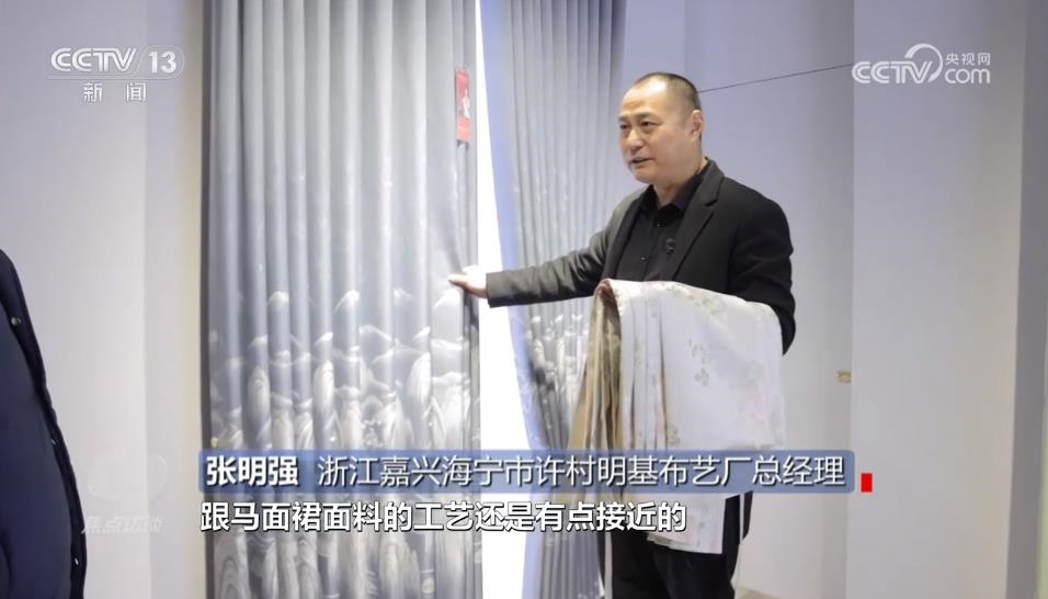 浙江嘉興海寧市許村明基布藝廠總經(jīng)理張明強:“提花其實比較接近,跟馬面裙面料的工藝有點接近,但是馬面裙的密度會超過它很多?!?/p>