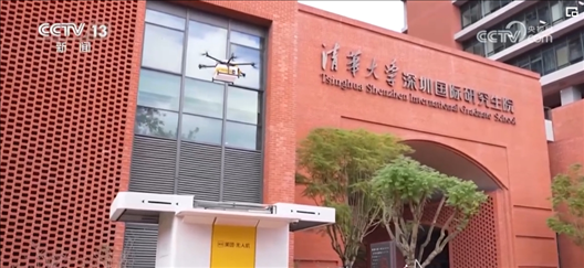 在深圳的一所大學(xué),一架無人機降落在外賣柜上方,通過精準(zhǔn)定位系統(tǒng)將外賣投入柜中。