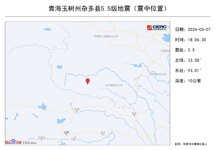 央視網(wǎng)消息:中國地震臺網(wǎng)正式測定:03月07日18時06分在青海玉樹州雜多縣(北緯33.58度,東經(jīng)93.01度)發(fā)生5.5級地震,震源深度10千米。據(jù)地震人口熱力圖數(shù)據(jù),震中周邊屬于高原無人區(qū),目前也暫未收到震感反饋。此次震中距離最近的西藏聶榮縣城177公里、距青海雜多縣城227公里,震中5公里范圍內(nèi)平均海拔約4809米。