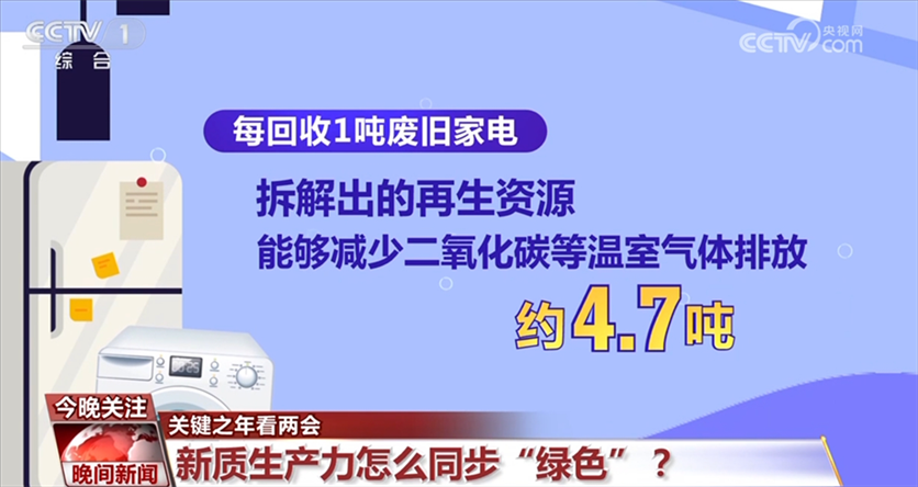 數(shù)據(jù)顯示,2023年,冰箱、洗衣機(jī)、空調(diào)等主要品類家電保有量超過30億臺(tái),一些家電使用了十多年、二十年,更新?lián)Q代的需求和潛力很大。據(jù)統(tǒng)計(jì),2023年,我國(guó)廢舊家電回收總量達(dá)450萬噸,而每回收1噸廢舊家電,拆解出的再生資源能夠減少二氧化碳等溫室氣體排放約4.7噸。