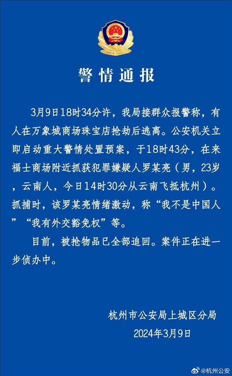 ·杭州市公安局上城分局通報杭州一商場男子搶劫金店。