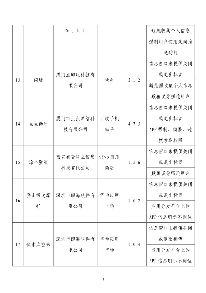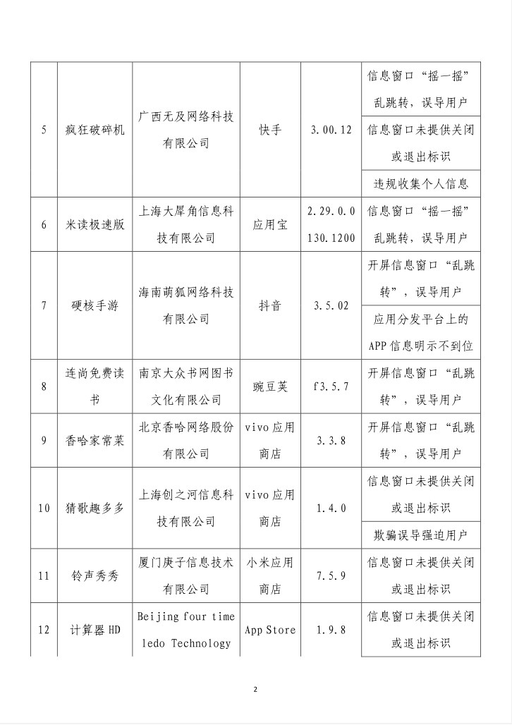 央視網(wǎng)消息:據(jù)工業(yè)和信息化部網(wǎng)站消息,工業(yè)和信息化部信息通信管理局3月14日公布《關(guān)于侵害用戶權(quán)益行為的APP(SDK)通報(bào)(2024年第2批,總第37批)》: