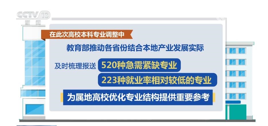 據(jù)介紹,在本次高校專業(yè)調(diào)整中,教育部推動(dòng)各省份結(jié)合本地產(chǎn)業(yè)發(fā)展實(shí)際,及時(shí)梳理報(bào)送了520種急需緊缺專業(yè)和223種就業(yè)率相對(duì)較低的專業(yè),為屬地高校優(yōu)化專業(yè)結(jié)構(gòu)提供重要參考。