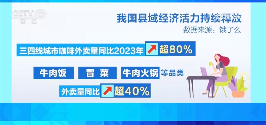 今年以來,三四線城市的餐飲消費(fèi)活力持續(xù)釋放。來自某生活服務(wù)平臺的數(shù)據(jù)顯示,今年開年后,三四線城市咖啡外賣量同比去年增長超過80%,牛肉飯、冒菜、牛肉火鍋等品類外賣量同比增長超過40%。春節(jié)假期期間,三四線城市螺螄粉、甜品、沙拉輕食、咖啡和奶茶果汁等熱門餐食的外賣量更是同比增長超過1倍。