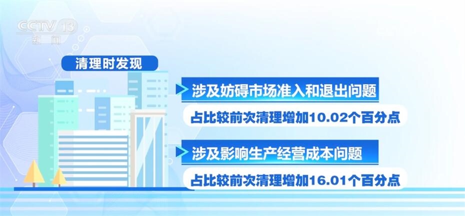 市場(chǎng)監(jiān)管總局表示,本次清理工作雖然取得顯著成效,但在清理時(shí)還發(fā)現(xiàn)涉及妨礙市場(chǎng)準(zhǔn)入和退出、影響生產(chǎn)經(jīng)營成本等領(lǐng)域問題占比較前次清理分別增加10.02和16.01個(gè)百分點(diǎn),涉及妨礙商品和要素自由流動(dòng)領(lǐng)域問題仍然較為突出。