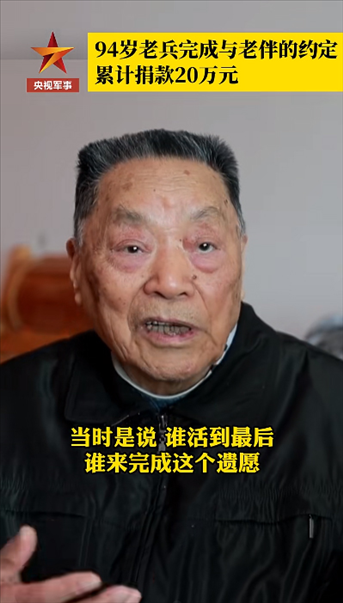 94歲老兵曾讓泉,78歲簽下捐贈(zèng)眼角膜協(xié)議,85歲開(kāi)始捐款,至今共計(jì)20萬(wàn)元。曾讓泉說(shuō),老伴2014年走了,當(dāng)時(shí)約定誰(shuí)活到最后誰(shuí)來(lái)完成每年省下錢來(lái)捐款這個(gè)遺愿。