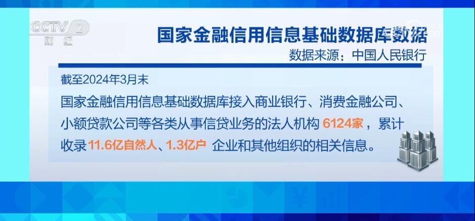 截至2024年3月末,國家金融信用信息基礎數(shù)據(jù)庫接入商業(yè)銀行、消費金融公司、小額貸款公司等各類從事信貸業(yè)務的法人機構6124家,累計收錄11.6億自然人、1.3億戶企業(yè)和其他組織的相關信息。