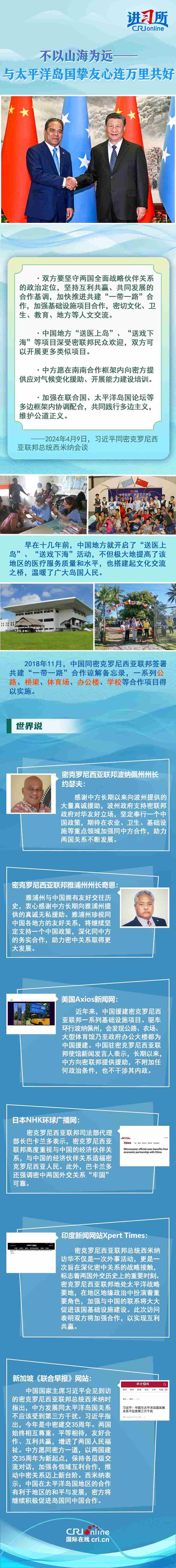 4月9日下午,中國國家主席習(xí)近平在北京同密克羅尼西亞聯(lián)邦總統(tǒng)西米納舉行會談時表示,每次見到太平洋島國的朋友,都感到很親切,中國地方“送醫(yī)上島”、“送戲下?!钡软椖可钍苊苈?lián)邦民眾歡迎,中方愿繼續(xù)為島國發(fā)展提供力所能及的支持,開展三方或多方合作。