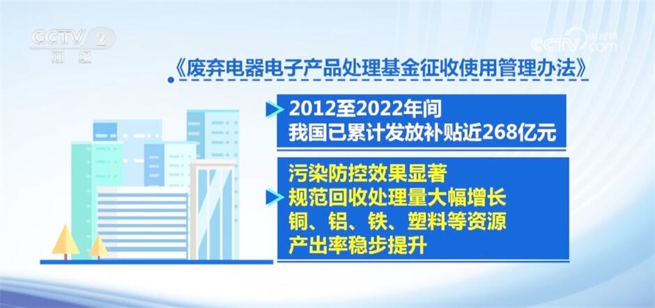 我國設(shè)立“廢棄電器電子產(chǎn)品處理基金”,用于補(bǔ)貼回收處理廢棄電器電子產(chǎn)品。根據(jù)《廢棄電器電子產(chǎn)品處理基金征收使用管理辦法》,2012至2022年間,我國已累計發(fā)放補(bǔ)貼近268億元,污染防控效果顯著,規(guī)范回收處理量大幅增長,銅、鋁、鐵、塑料等資源產(chǎn)出率穩(wěn)步提升。