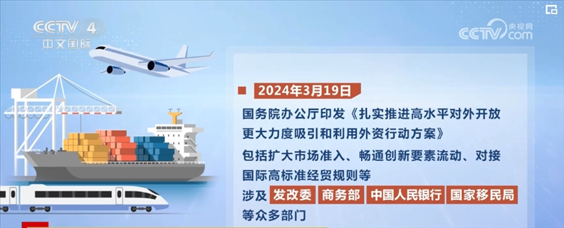 2024年3月19日,國務(wù)院辦公廳印發(fā)《扎實(shí)推進(jìn)高水平對(duì)外開放 更大力度吸引和利用外資行動(dòng)方案》,包括擴(kuò)大市場(chǎng)準(zhǔn)入、暢通創(chuàng)新要素流動(dòng)、對(duì)接國際高標(biāo)準(zhǔn)經(jīng)貿(mào)規(guī)則等,涉及國家發(fā)展改革委、商務(wù)部、中國人民銀行、國家移民局等眾多部門。