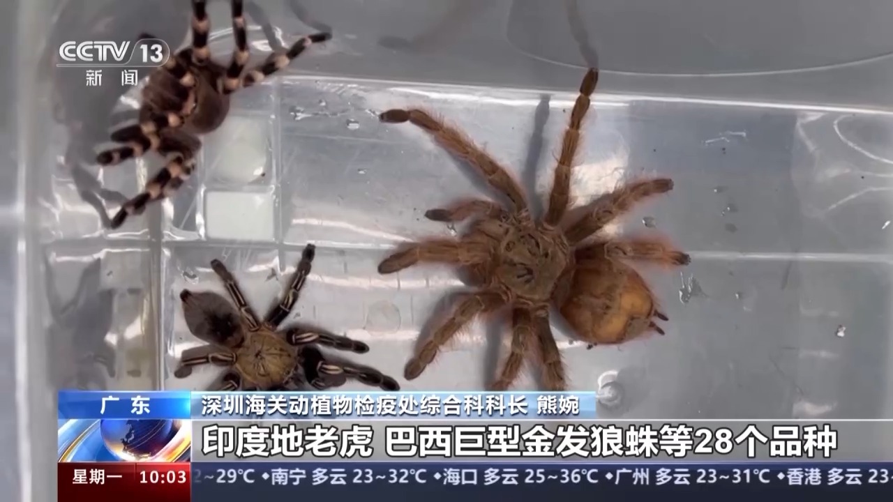 深圳海關(guān)動(dòng)植物檢疫處綜合科科長(zhǎng) 熊婉:查驗(yàn)關(guān)員在對(duì)轉(zhuǎn)運(yùn)快件開展監(jiān)管時(shí),發(fā)現(xiàn)一票申報(bào)品名為“相機(jī)三腳架”的快件包裹機(jī)檢圖像異常,不符合相機(jī)三腳架的圖像特征,隨后進(jìn)行了開包查驗(yàn)。經(jīng)過專業(yè)機(jī)構(gòu)鑒定,這批活體蜘蛛是墨西哥金背紅尾蛛、印度地老虎、巨人偽鳴蛛、巴西巨型金發(fā)狼蛛等28個(gè)品種。