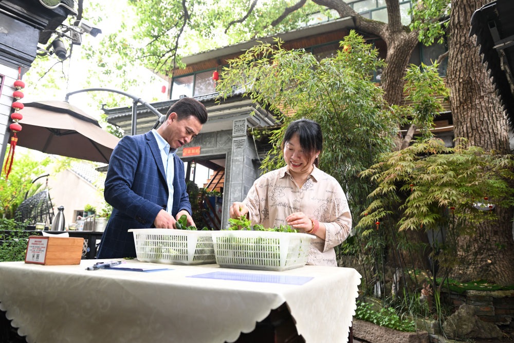 2024年4月11日,在江蘇省蘇州市吳中區(qū)金庭鎮(zhèn),退捕漁民沈雪榮和妻子沈燕燕在自家經(jīng)營的農(nóng)家樂“美味漁家蟹園”擇菜?!巴瞬逗?,太湖的生態(tài)環(huán)境越來越好,游客越來越多,我們家的農(nóng)家樂生意也越來越紅火?!鄙蜓s感慨道。
