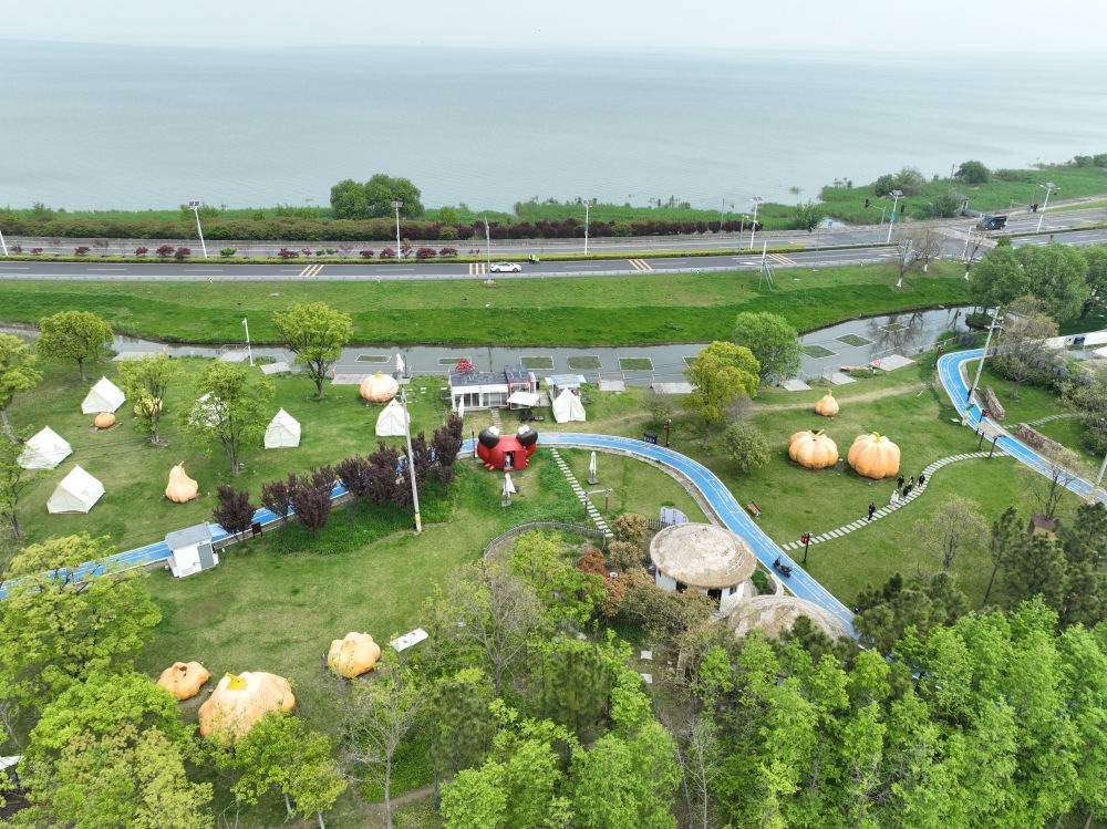 2024年4月11日,浙江省湖州市吳興區(qū)綜合行政執(zhí)法局高新區(qū)中隊執(zhí)法人員駕車在太湖沿岸巡查(無人機(jī)照片)。