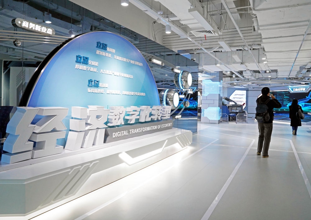 觀眾在位于上海市楊浦區(qū)景星路的上海城市數(shù)字化轉(zhuǎn)型體驗(yàn)館參觀(2023年4月7日攝)。該館展示上海各方面數(shù)字化轉(zhuǎn)型的規(guī)劃布局和最新實(shí)踐。