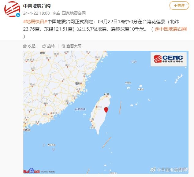 央視網(wǎng)消息:中國地震臺(tái)網(wǎng)正式測(cè)定:04月22日18時(shí)50分在臺(tái)灣花蓮縣(北緯23.76度,東經(jīng)121.51度)發(fā)生5.7級(jí)地震,震源深度10千米。