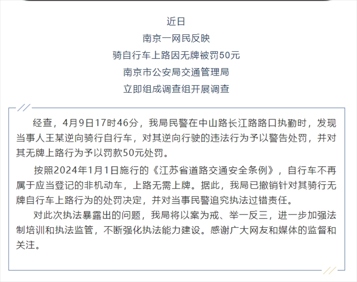 ·南京交警回應(yīng)市民騎自行車無牌被罰50元:撤銷處罰,追究民警責(zé)任。