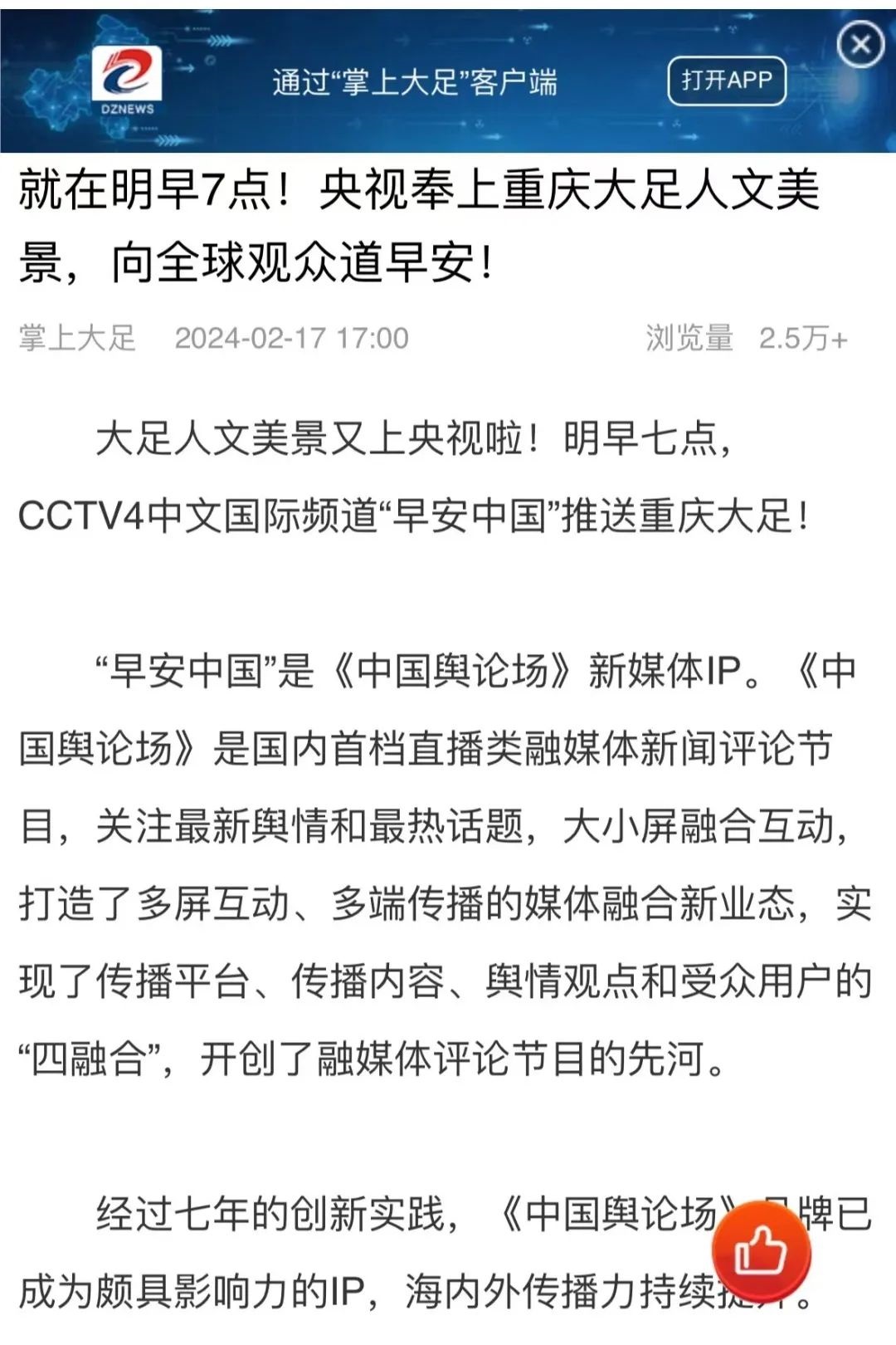 “央視帶你看綠美臺(tái)山,這次關(guān)注的是......”“就在明早7點(diǎn)!央視奉上重慶大足人文美景,向全球觀眾道早安!”“央視聚焦!徐州,有美景,有年味”“金葵向陽(yáng)開,中春好景和風(fēng)裁!美麗江門與您相遇央視《早安中國(guó)》”……越來(lái)越多的地方政府伸出橄欖枝,希望《早安中國(guó)》多“來(lái)”當(dāng)?shù)匾挥[好風(fēng)光。