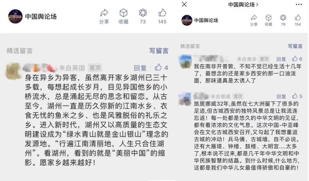 “早安中國(guó)切口新穎,有文化屬性和微記錄的氣質(zhì)。”“每次片尾的結(jié)語(yǔ)字幕,都是從哪里選的?每天,都給我學(xué)習(xí)的機(jī)會(huì)?!薄皩I(yè)微記錄是媒體融合最寬廣的路?!薄对绨仓袊?guó)》真真切切地緩解了許多海內(nèi)外網(wǎng)友的故土思鄉(xiāng)情切,也收到了來(lái)自四面八方的認(rèn)可及反饋?!吨袊?guó)輿論場(chǎng)》節(jié)目持續(xù)發(fā)出“游子看故鄉(xiāng)”征集令,請(qǐng)海外華僑華人說(shuō)出對(duì)家鄉(xiāng)的思念和心中最想“打卡”的祖國(guó)美景。