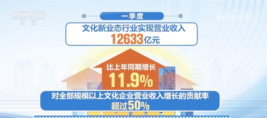 文化新業(yè)態(tài)行業(yè)持續(xù)發(fā)揮帶動效應(yīng),一季度,文化新業(yè)態(tài)行業(yè)實(shí)現(xiàn)營業(yè)收入12633億元,比上年同期增長11.9%,對全部規(guī)模以上文化企業(yè)營業(yè)收入增長的貢獻(xiàn)率超過50%。