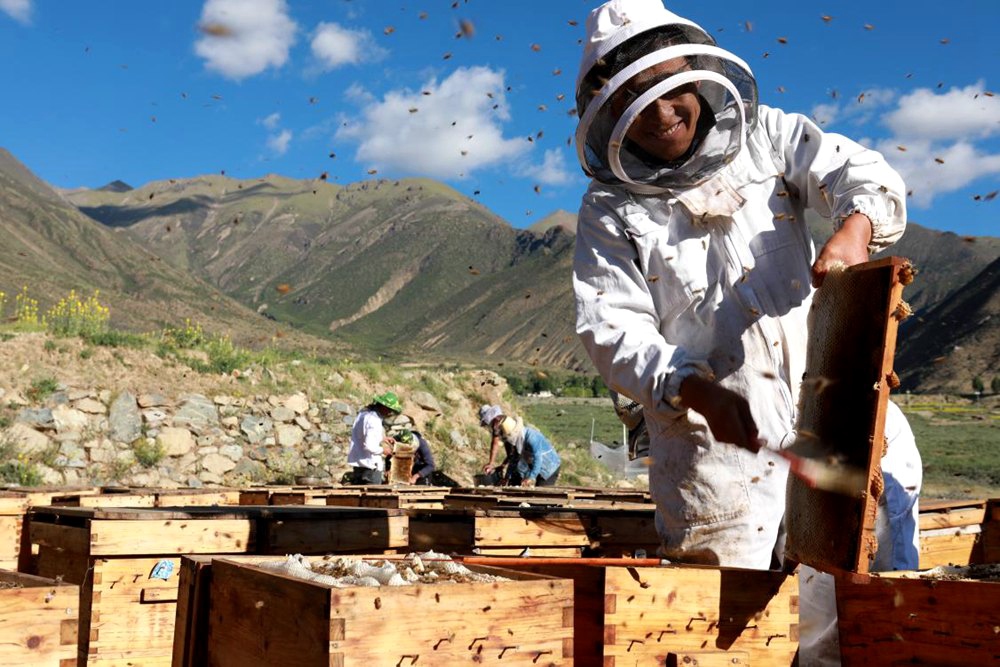 2016年,張亮富帶著20個蜂箱和一頂帳篷從貴州來到西藏,在有著大片蜜源的山南扎根發(fā)展自己的“甜蜜”事業(yè)。這是一場雙向奔赴。山南市通過引入蜜蜂養(yǎng)殖企業(yè)、培育本土企業(yè),將“甜蜜產(chǎn)業(yè)”送入7縣區(qū)近5千戶人家。依靠這份“甜蜜”事業(yè),山南市成功打造了西藏野花蜂蜜、野花蜂王漿、蜂蜜面膜等特色優(yōu)勢產(chǎn)品,優(yōu)質(zhì)蜂蜜年產(chǎn)量超過300噸,產(chǎn)值超過1億元,帶動了當?shù)亟?.8萬人增收。