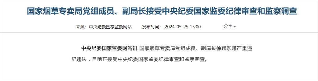 央視網(wǎng)消息:中央紀(jì)委國(guó)家監(jiān)委網(wǎng)站消息,國(guó)家煙草專賣局黨組成員、副局長(zhǎng)接受中央紀(jì)委國(guó)家監(jiān)委紀(jì)律審查和監(jiān)察調(diào)查。