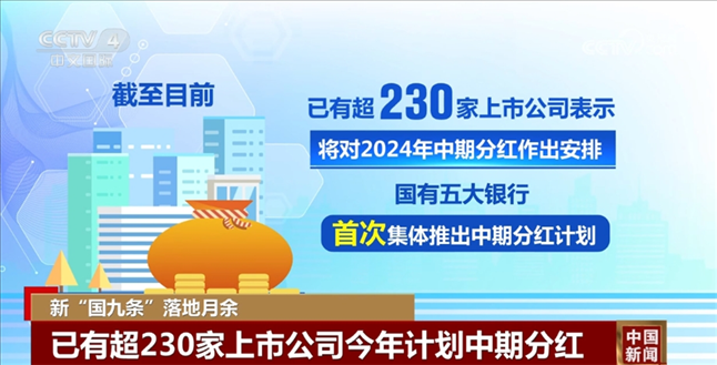 數(shù)據(jù)顯示,截至目前,已有超230家上市公司表示將對(duì)2024年中期分紅作出安排。其中,國(guó)有五大銀行首次集體推出中期分紅計(jì)劃。