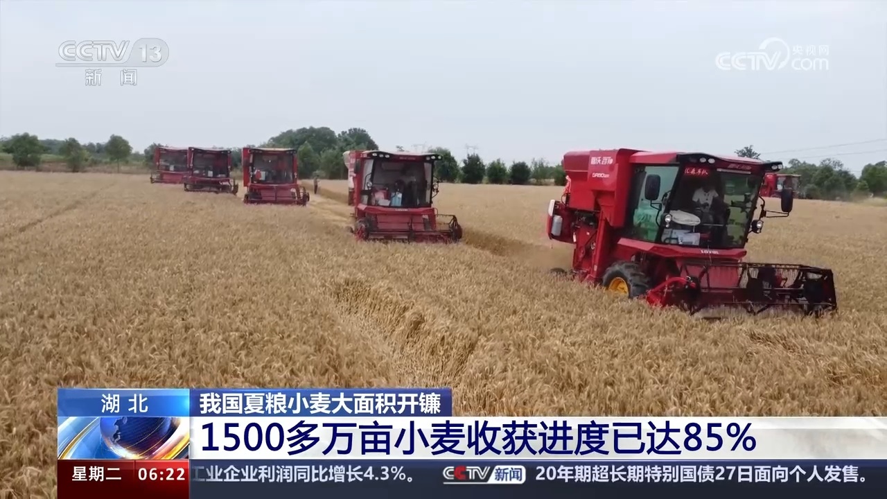 記者從湖北省農(nóng)業(yè)農(nóng)村廳了解到,截至5月26日,湖北省1500多萬(wàn)畝小麥?zhǔn)斋@進(jìn)度達(dá)85%。