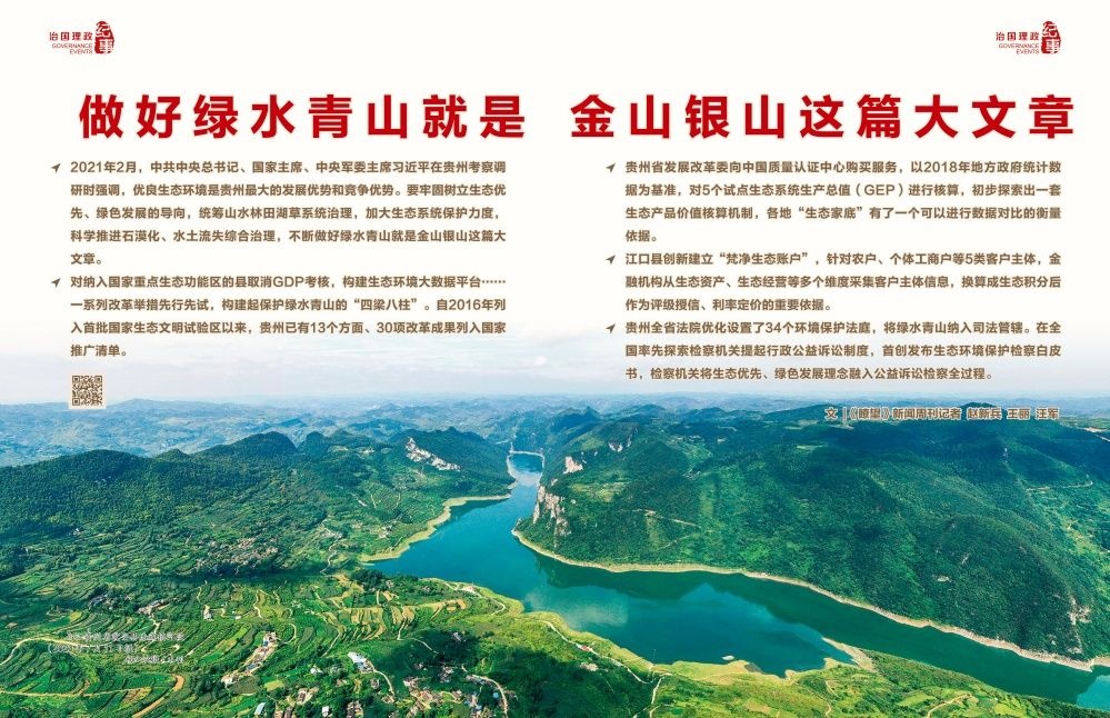 2022年初,《國(guó)務(wù)院關(guān)于支持貴州在新時(shí)代西部大開發(fā)上闖新路的意見》出臺(tái),正式賦予貴州生態(tài)文明建設(shè)先行區(qū)的戰(zhàn)略定位,要求貴州堅(jiān)持生態(tài)優(yōu)先、綠色發(fā)展,筑牢長(zhǎng)江、珠江上游生態(tài)安全屏障,科學(xué)推進(jìn)石漠化綜合治理,構(gòu)建完善生態(tài)文明制度體系,不斷做好綠水青山就是金山銀山這篇大文章。