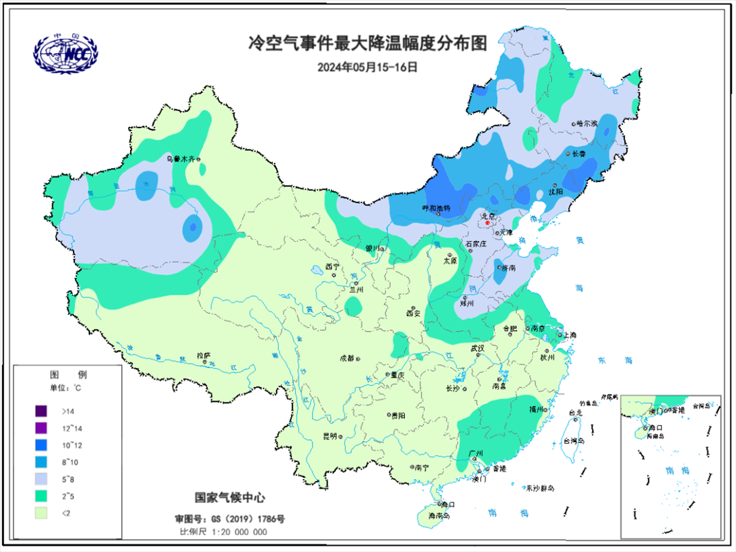 圖8 2024年5月15-16日全國最大降溫幅度分布圖